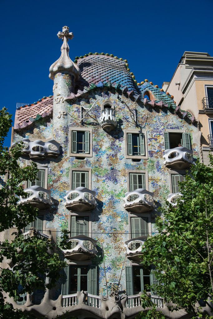 The facade of Casa Batllò was made with stone of the mountain of Montjuich, The columns have bone form, with vegetal representations. The carpentry has curved surfaces, and the windows are made of circular colored glass. The balconies have iron railings in the shape of a mask, which give the facade a shape. The facade is lined with pieces of glass of various colors (the trencadís), which Gaudí obtained in the waste of a glass factory, and remembers the waves of the Mediterranean Sea or the forms of the mountain of Montserrat.