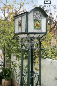 It is one of his best works, the green color, beyond the sgraffito, appears in ceramics, garden fences and windows, printing a unique personality. From the street we can already appreciate the magic of this house, the entrance is formed by a low stone wall with green and white ceramic pieces, and a wrought iron grate worked in «coup de fouet»